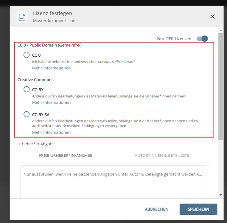 Im folgenden Fenster können Sie zwischen den Lizenzen CC 0/Public Domain, CC-BY und CC-BY-SA auswählen.